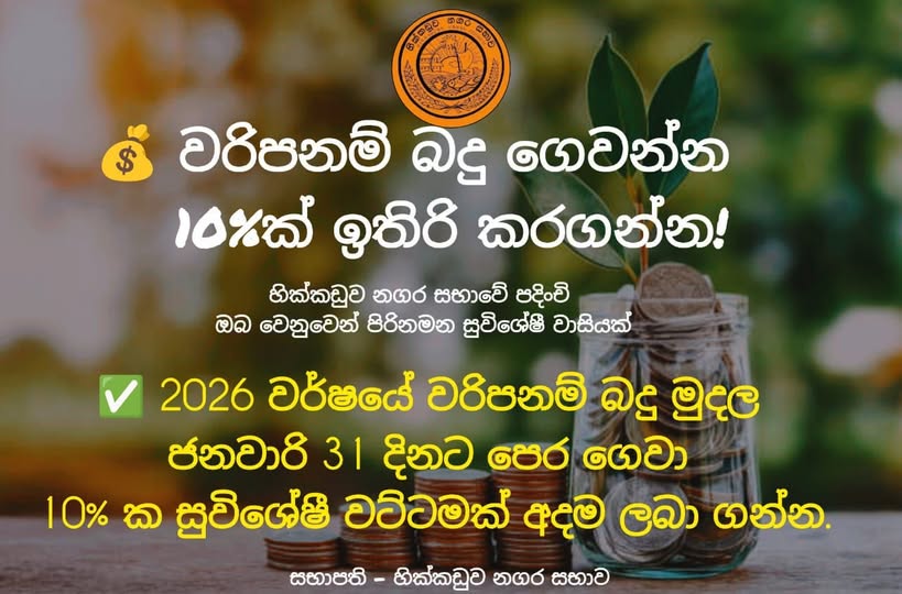 වරිපනම් බදු ගෙවා ඔබේ ප්රදේශයේ සංවර්ධනයට දායක වන්න. නීතිගරුක පුරවැසියෙකු වීම ඔබ සතු වගකීමකි!