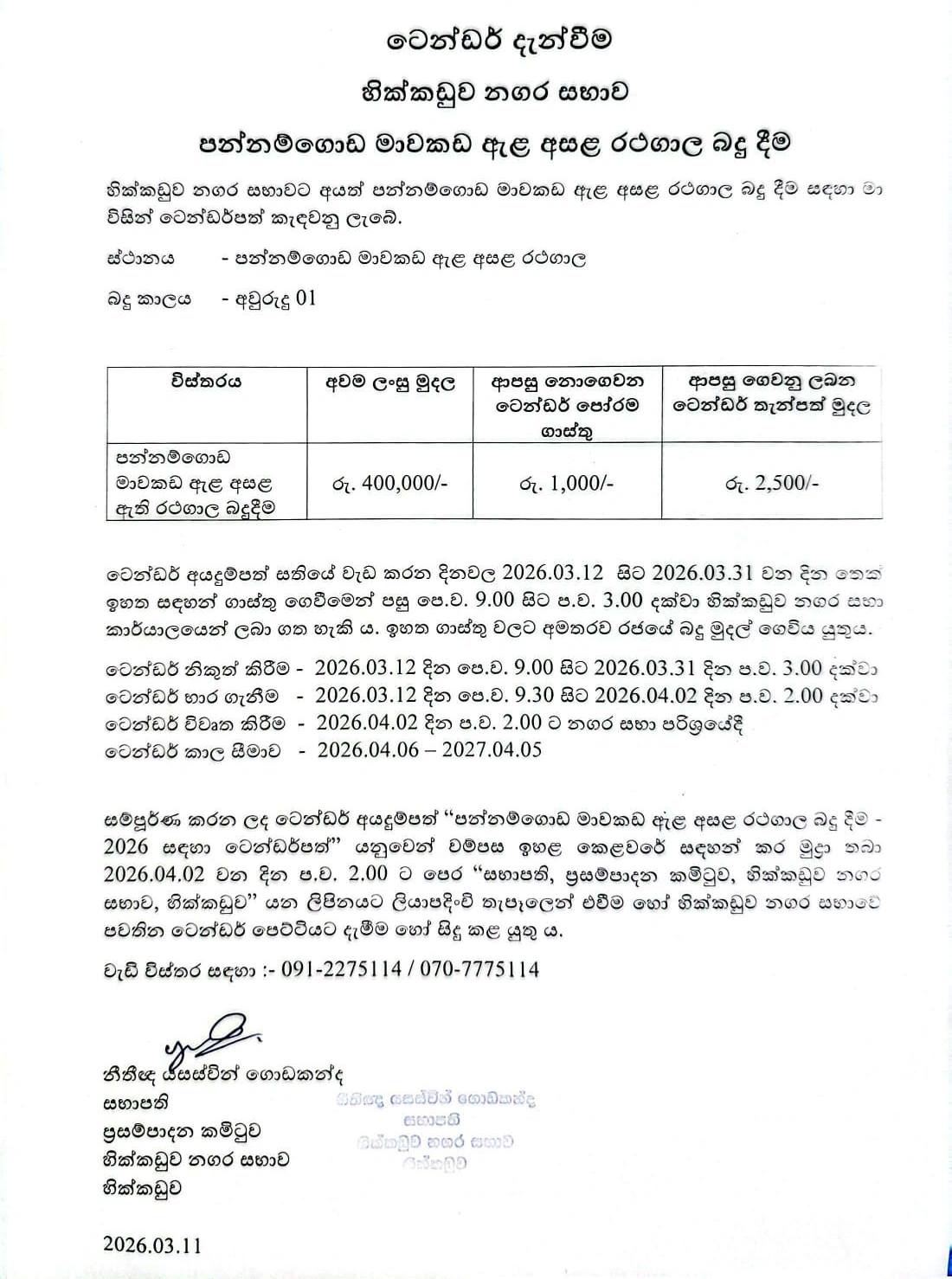 හික්කඩුව නගර සභාවට අයත් පන්නම්ගොඩ මාවකඩ ඇළ අසළ රථගාල බදු දීම සඳහා මා ටෙන්ඩර්පත් කැඳවනු ලැබේ.